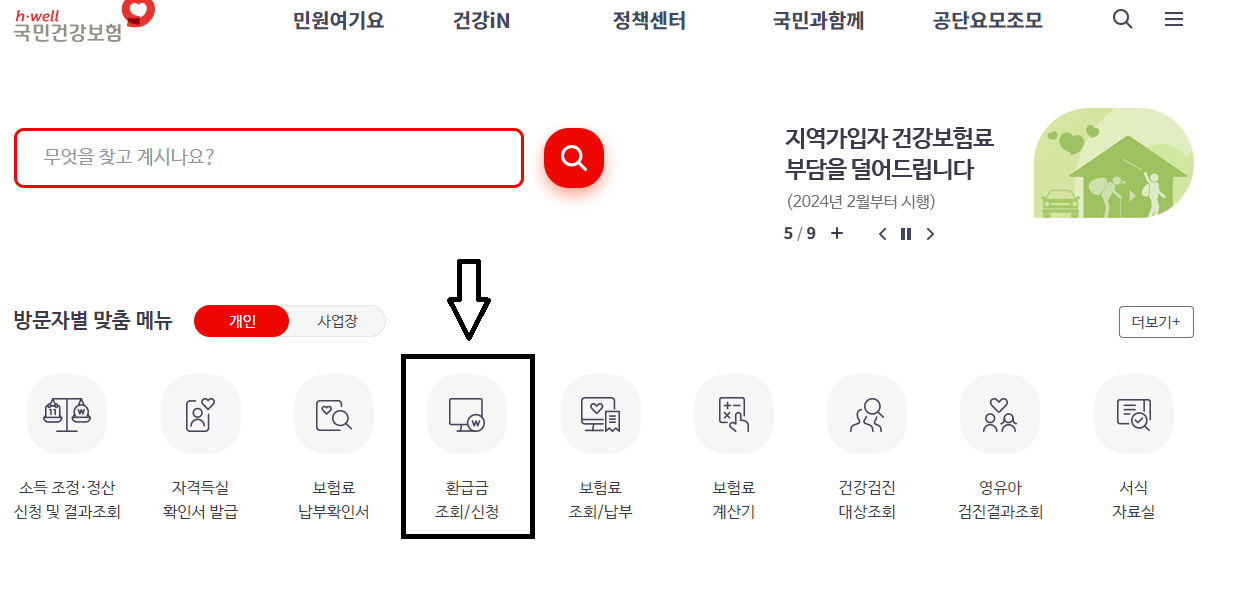 조회하는 분이 가입자인 경우 본인은 물론 현재 동일 건강보험증에 등재되어 있는 피부양자(세대원)의 환급금 내역조회와 지급신청이 가능합니다.